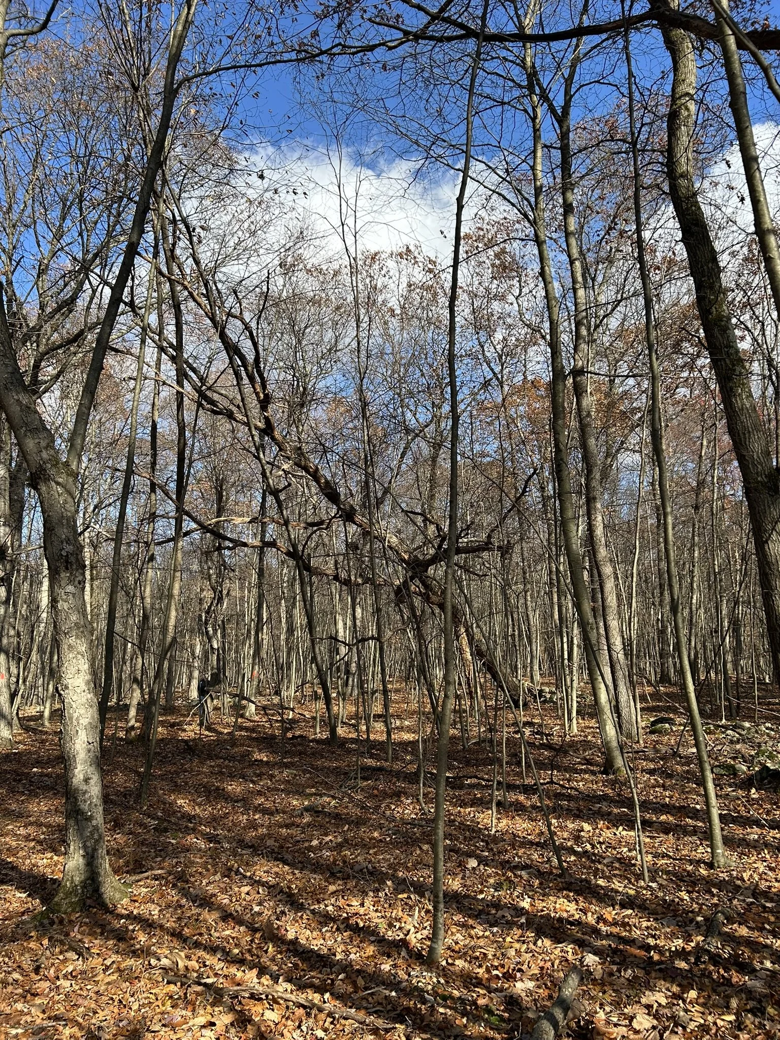 Today, we land on the Maureen Ogden Preserve near Long Valley, a 228-acre wooded property atop Schooley’s Mountain ridge. We choose the red trail for our walk because it stays almost entirely in the woods versus the longer blue trail that involves walking along the road for a stretch. At less than a mile, the red trail provides a leisurely, woodsy loop with plenty of fresh air on a crisp autumn day.